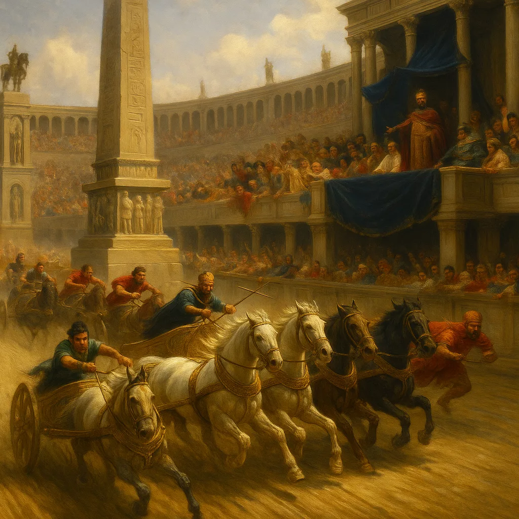 🎬 Sous les acclamations des Verts et des Bleus, les chars filaient à toute allure autour de la spina. Les sabots résonnaient, la poussière s’élevait, et Justinien, dans sa loge impériale, suivait la course où se mêlaient passion, politique et destin de la cité.