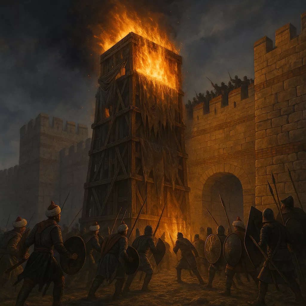 On the night of May 18-19, 1453, the Ottomans launched an assault tower against the walls in the St. Romanus sector. The Byzantine defenders resisted and set it on fire.