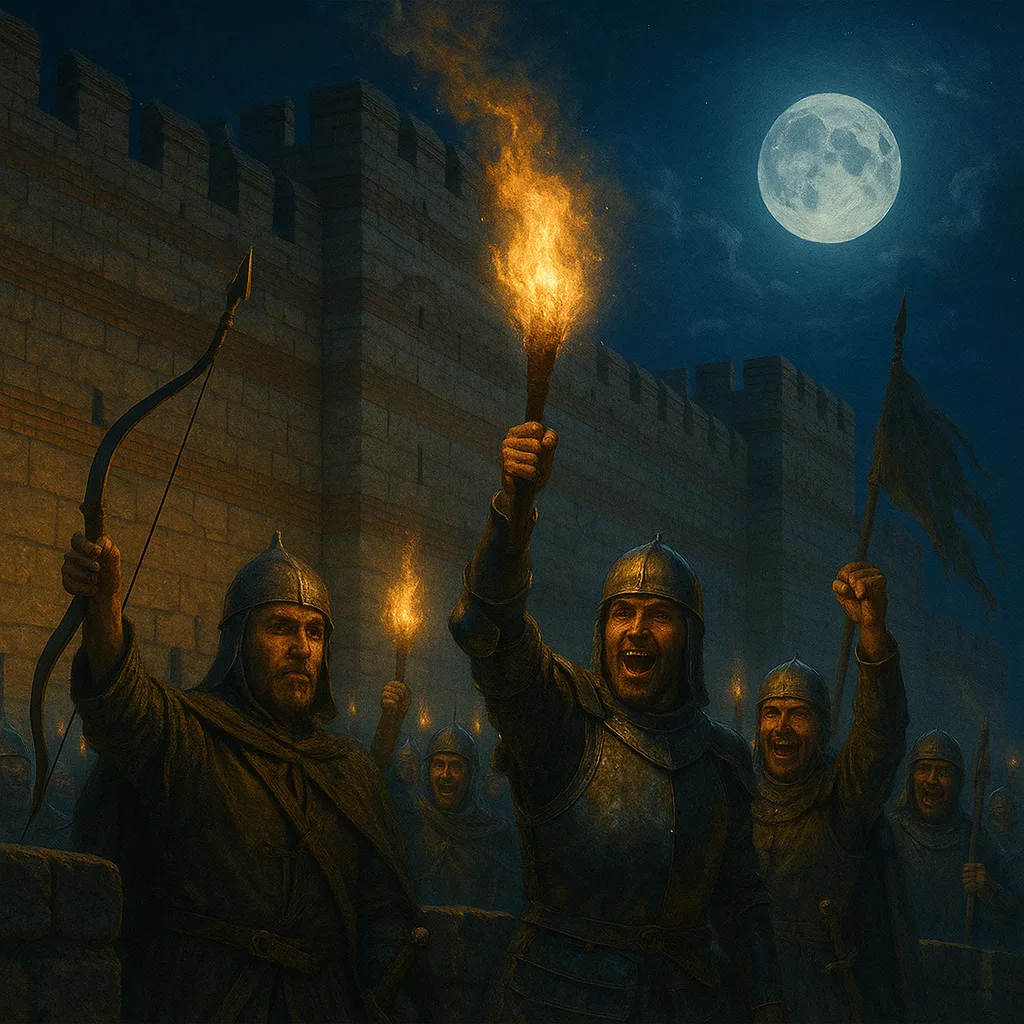 From April 12 to May 29, 1453, the Basilisk and cannons bombarded the city walls: each shot raised dust and debris. The Byzantines cushioned the impacts by filling breaches with earth, fascines, and rubble until nightfall. The stone groaned, but the line held.