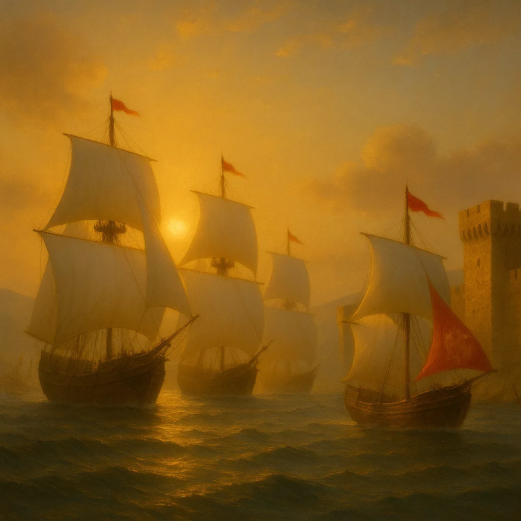 On April 20, 1453, three Genoese merchant ships sent by the Pope and one Byzantine ship, all laden with provisions, weapons, and soldiers, broke through the Ottoman blockade. After several hours of fighting at the entrance to the Bosphorus, they entered the Golden Horn to the cheers of the crowd.